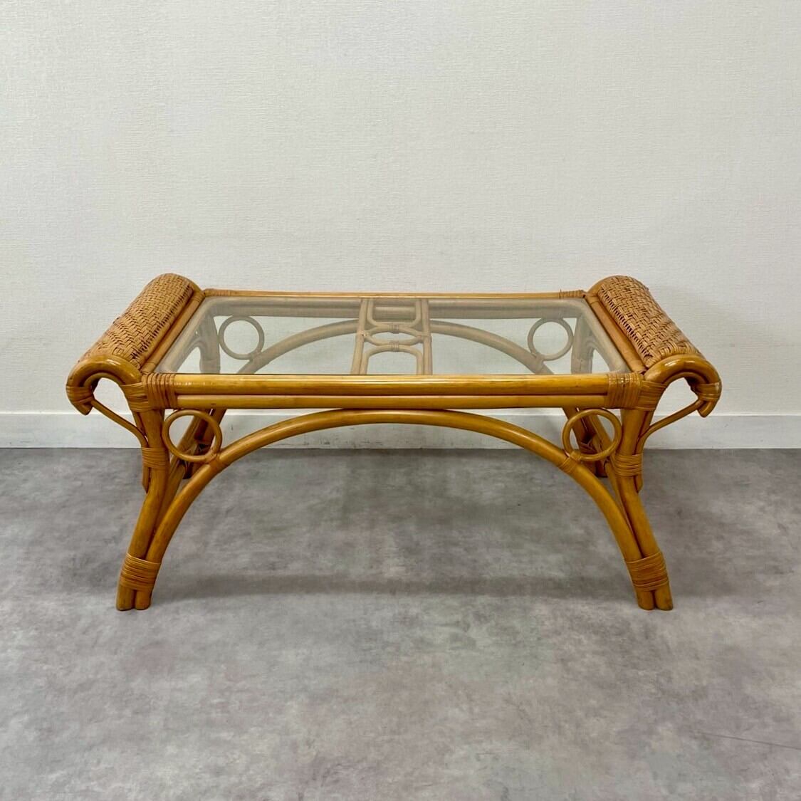 ナチュラルな色合い、印象的なフォルムが魅力のラタンテーブルです。
