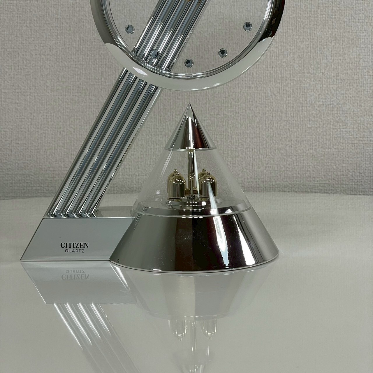 1980年代のCITIZENによるテーブルクロックです。円と直線を組み合わせた幾何学的なフォルムに、鏡面仕上げのメタルとクリア素材のコントラストが美しく映えるデザイン。