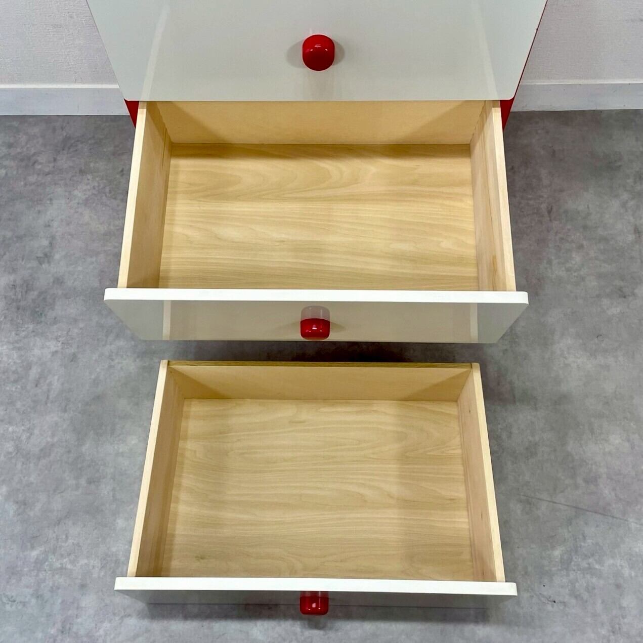 丸みを帯びた赤の取手が目を惹くレトロな4段チェストです。