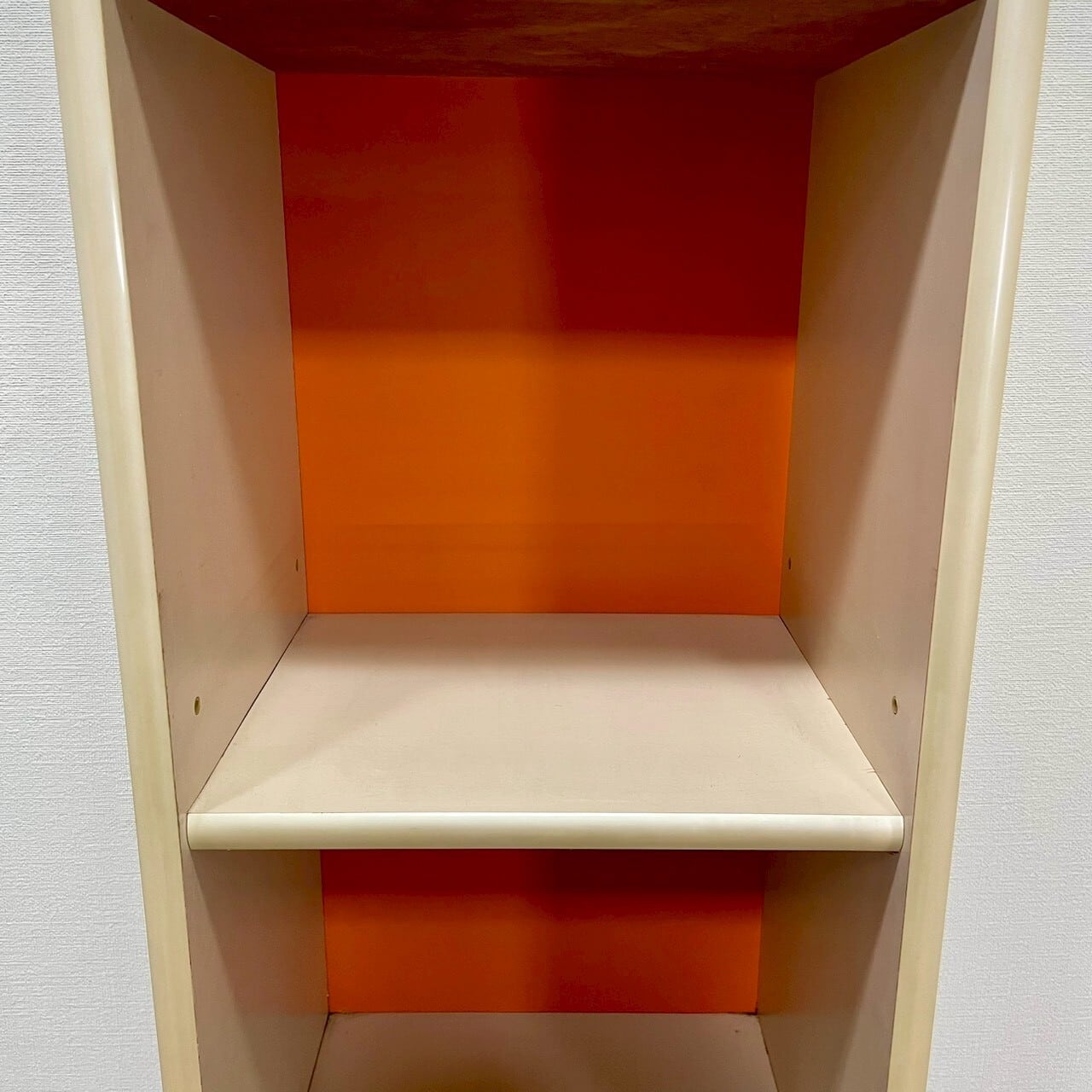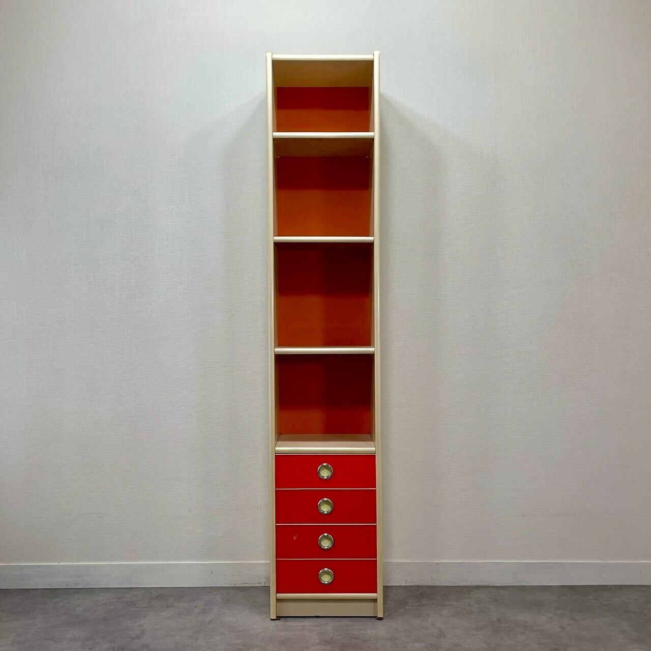 鮮やかなオレンジカラーが目を惹く、昭和レトロなスリムタイプのシェルフチェストです。
