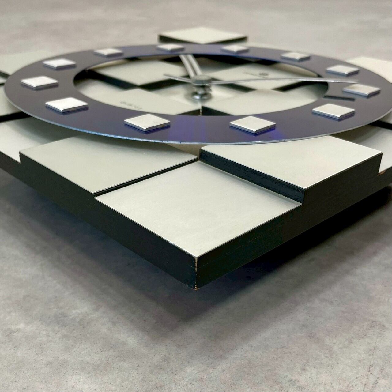 ランダムな起伏を持たせた25枚のスクエアアルミで構成されたフェイスプレートに、12個のスクエアインデックスを配したメタルブルーのリングを重ねた幾何学的なデザインが印象的。