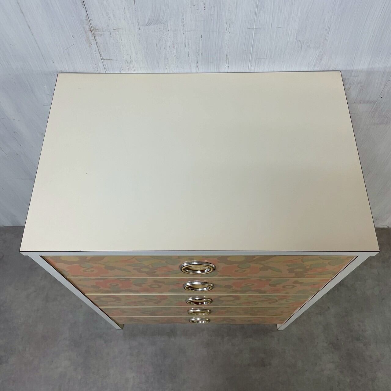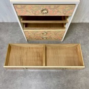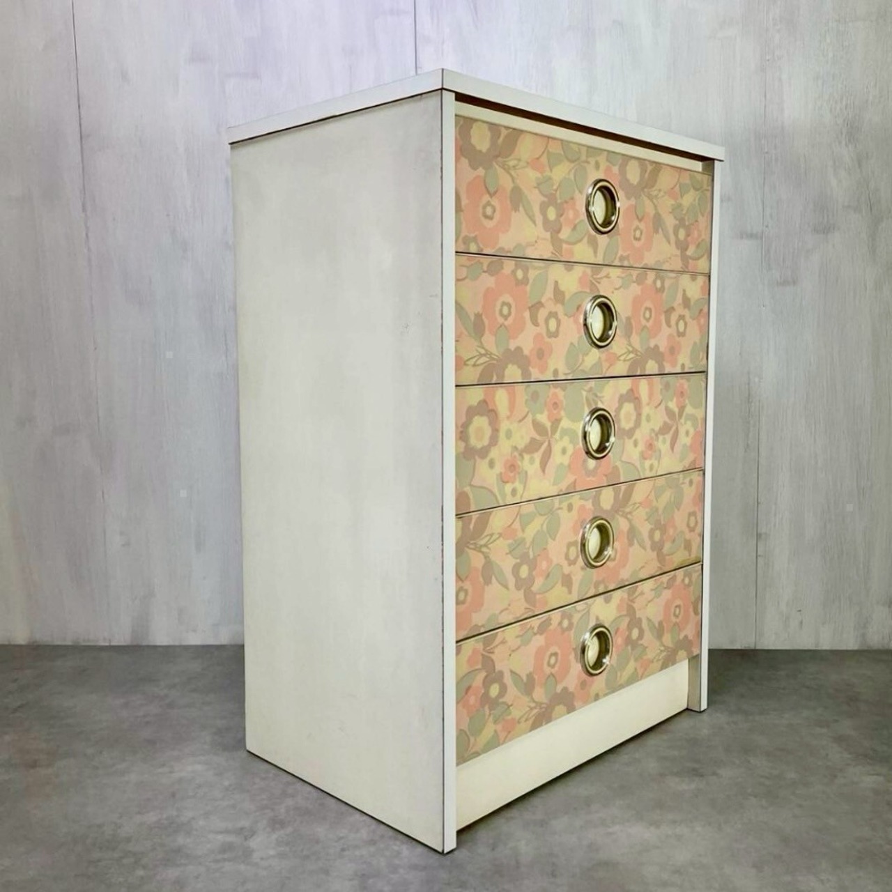 淡いピンクにポップな花柄がとても可愛いく、レトロな雰囲気を演出してくれる素敵なチェストです。