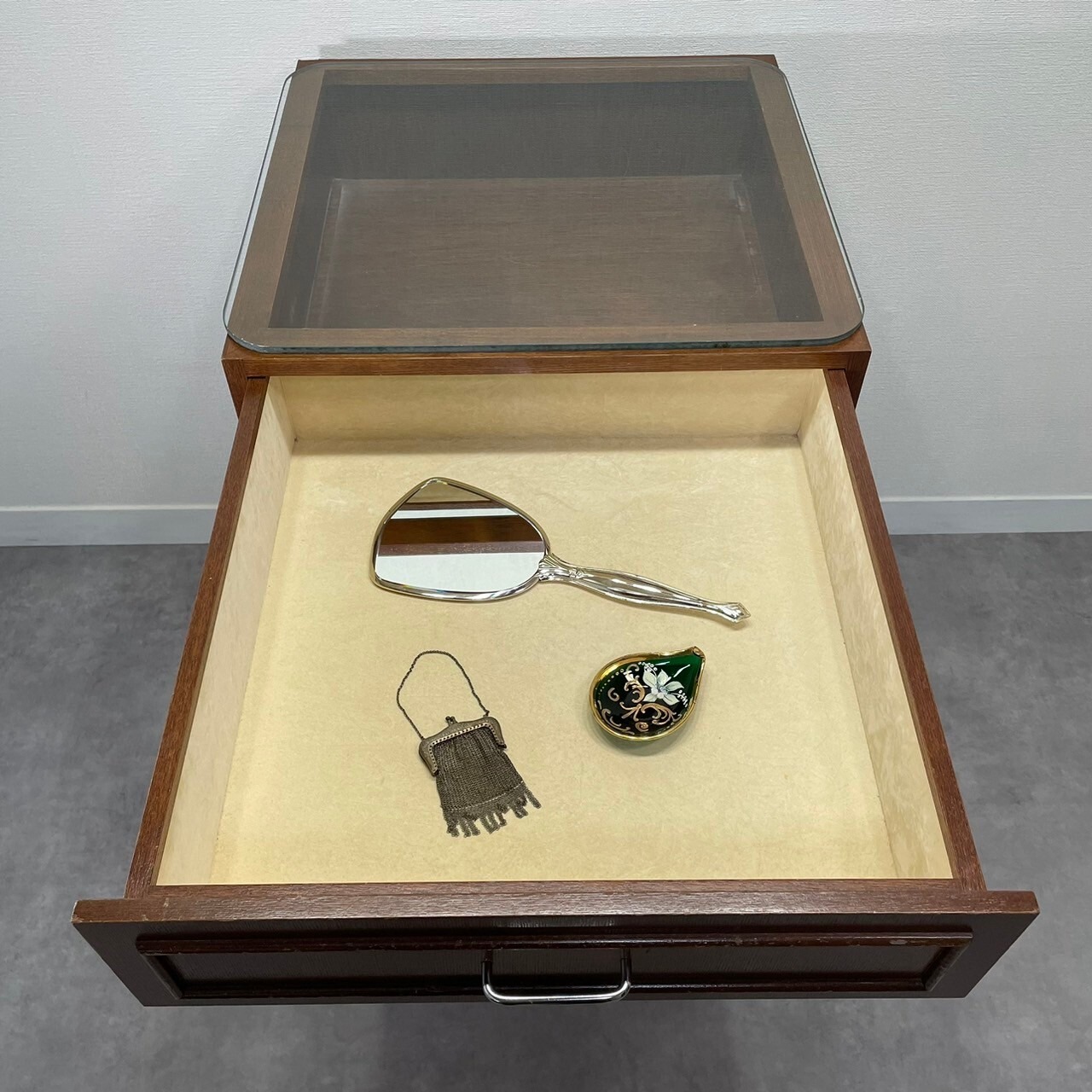 天板部分はガラスになっており、最上段のスライド棚はお気に入りの小物やジュエリーなどを見せる収納をして頂けます。