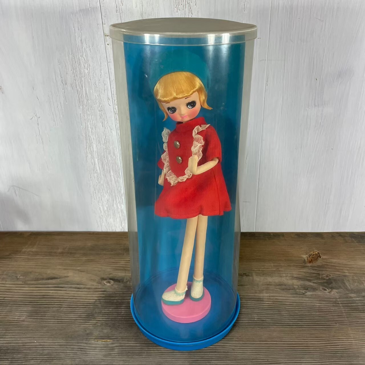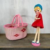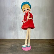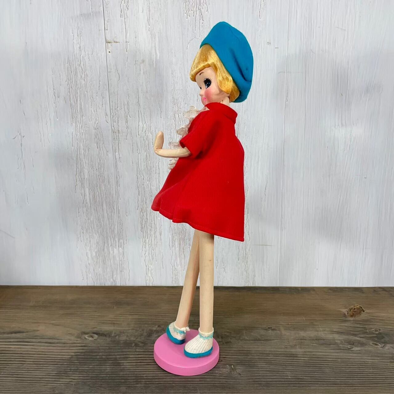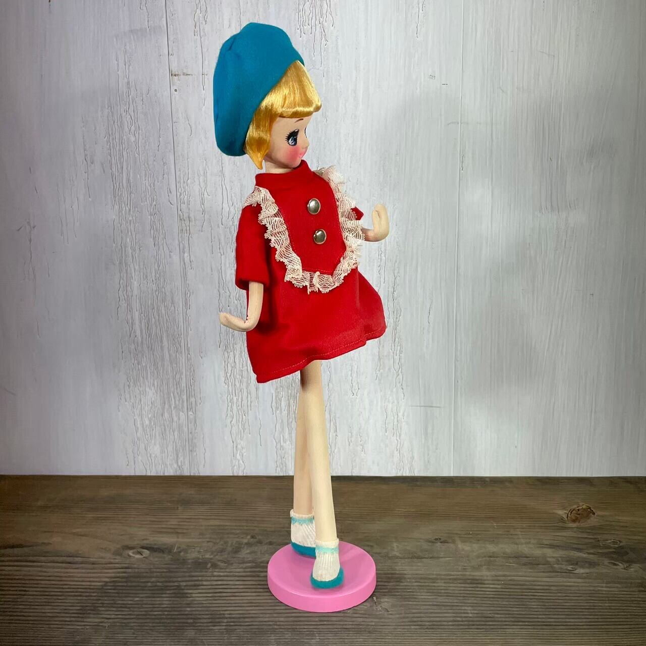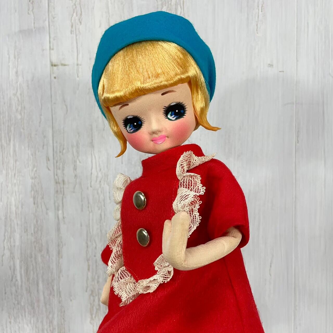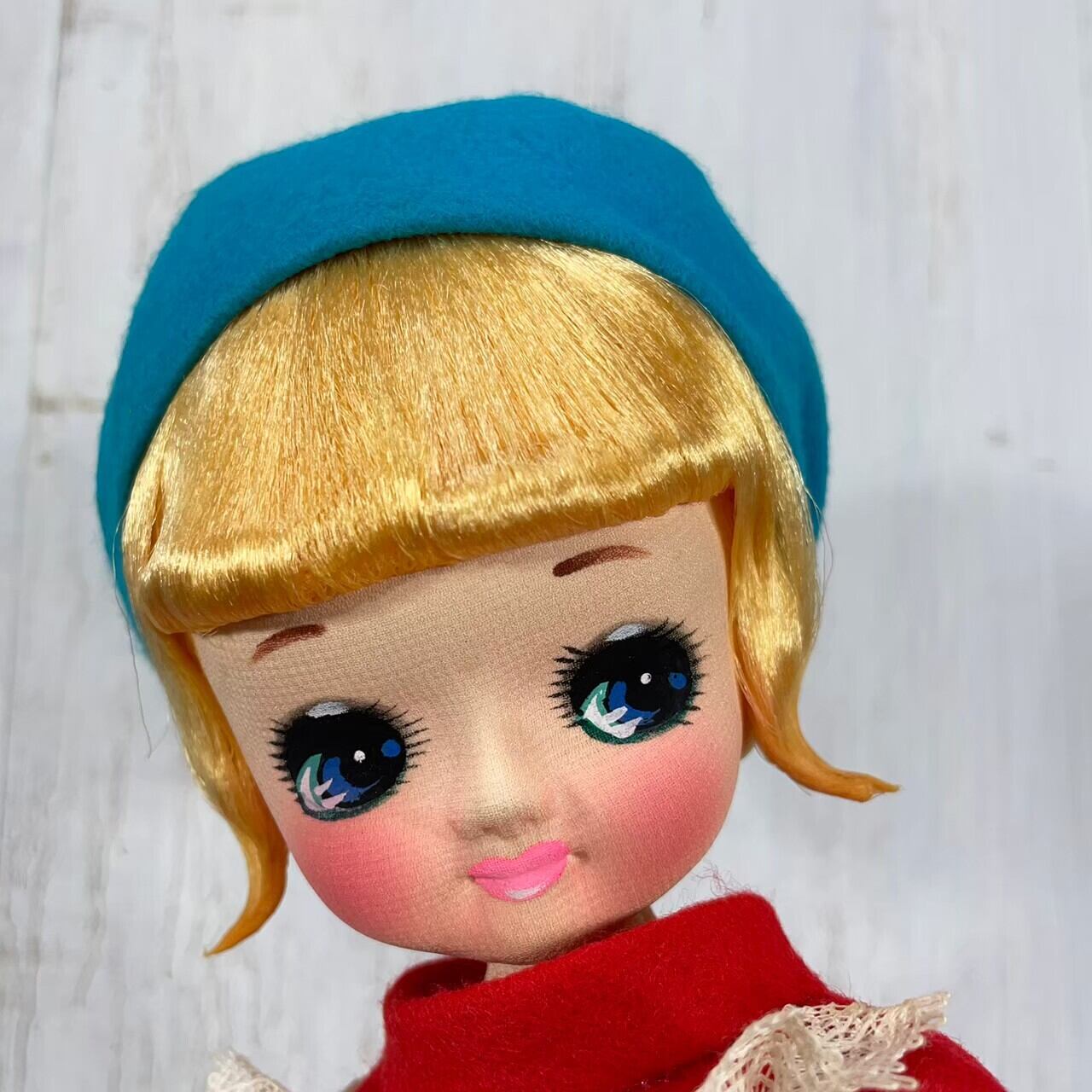 ブロンズヘアーに青の帽子と赤のワンピースの配色、レトロ感のあるコーデがとても可愛いです。