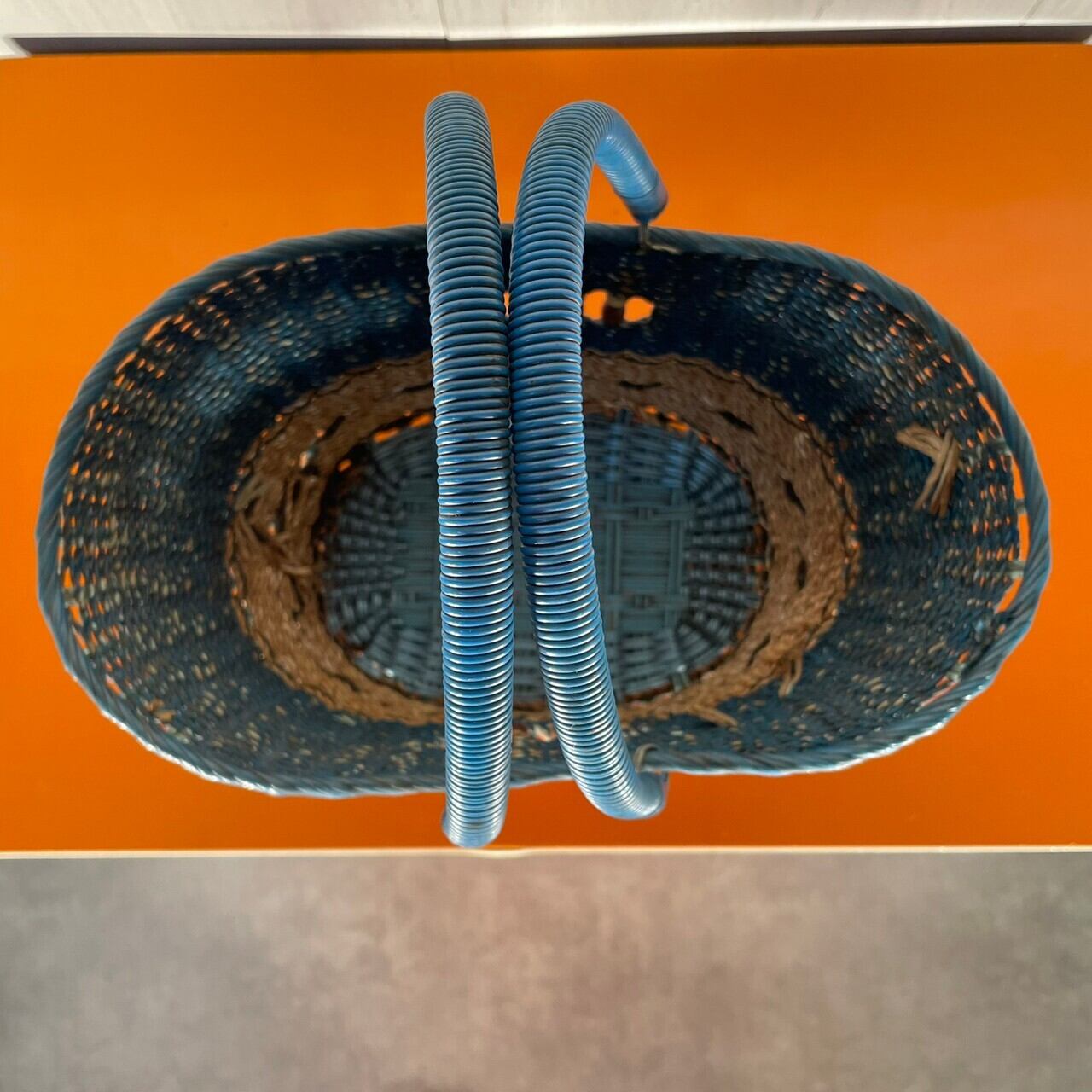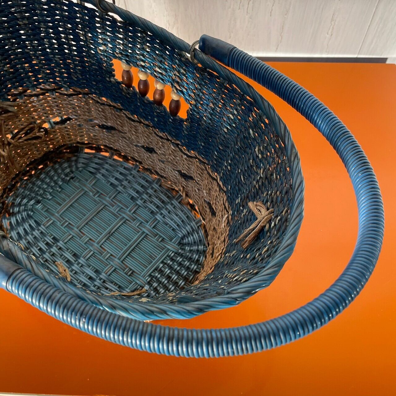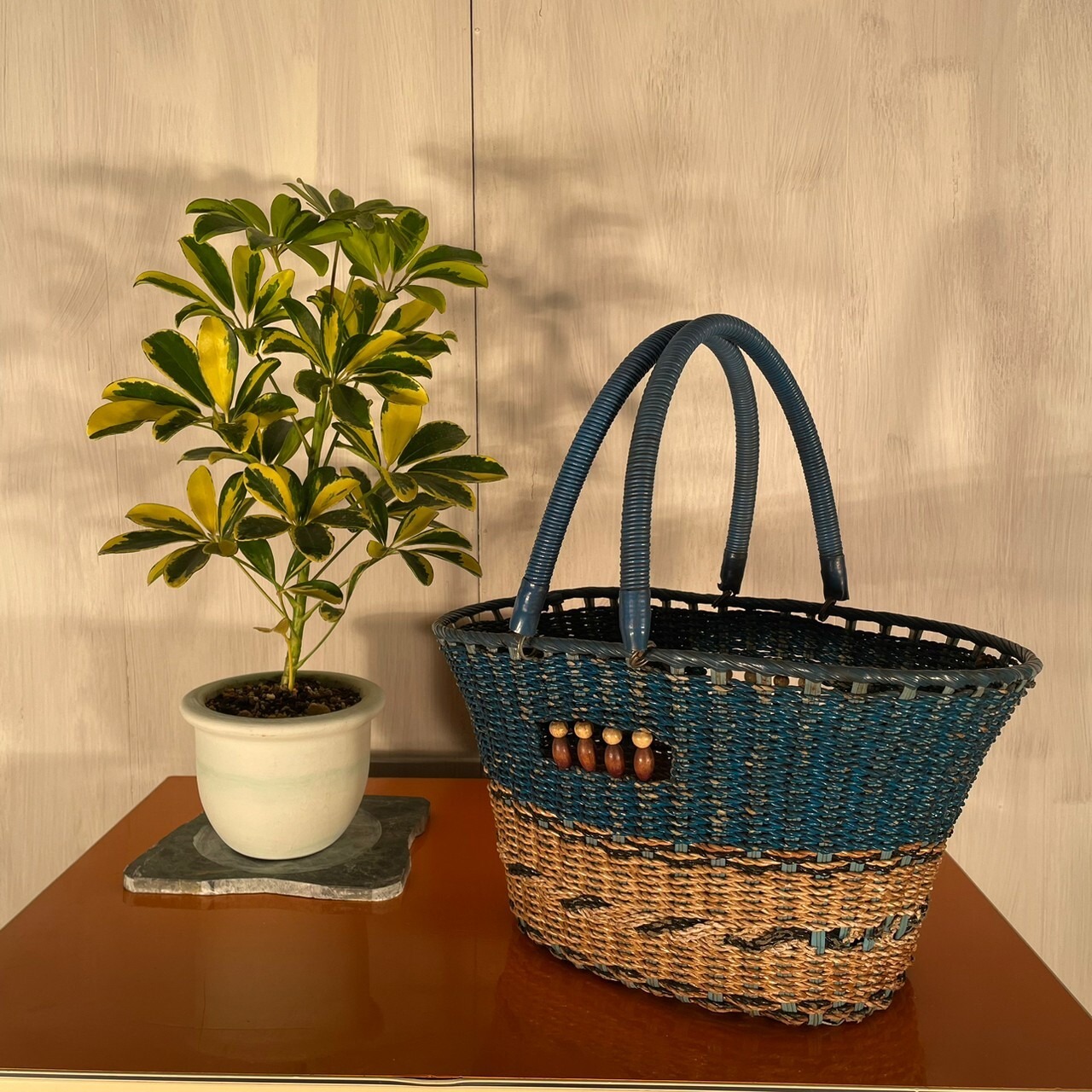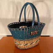 青とベージュのバイカラーに木の玉がアクセントとなり個性的で可愛いデザインです。