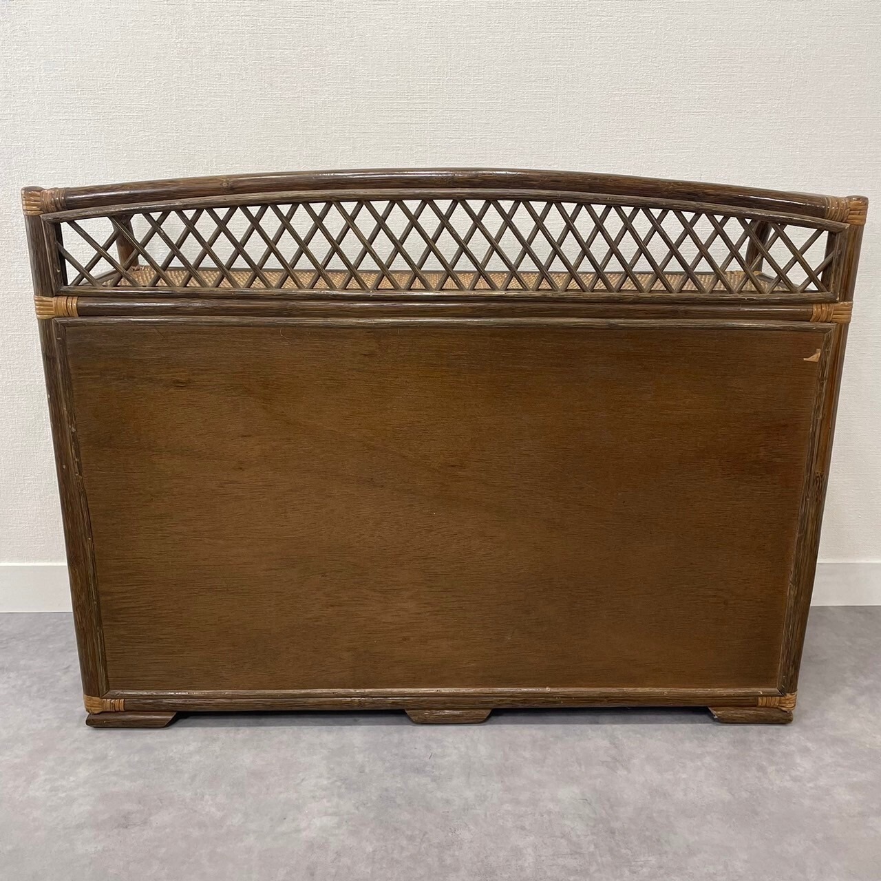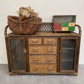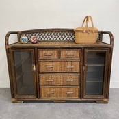両サイドのガラス扉、籐飾りが可愛らしく上段に小物を飾って魅せる収納もお楽しみ頂けます。