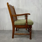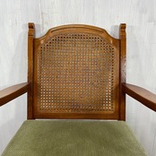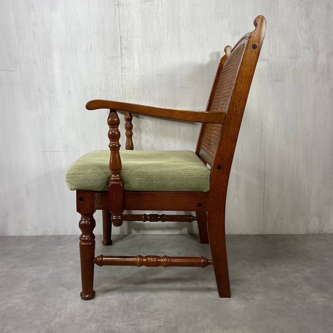籐張りの背もたれに両側アームレスト、脚部には伝統的な挽物細工を使用したクラシカルで凝ったデザイン。