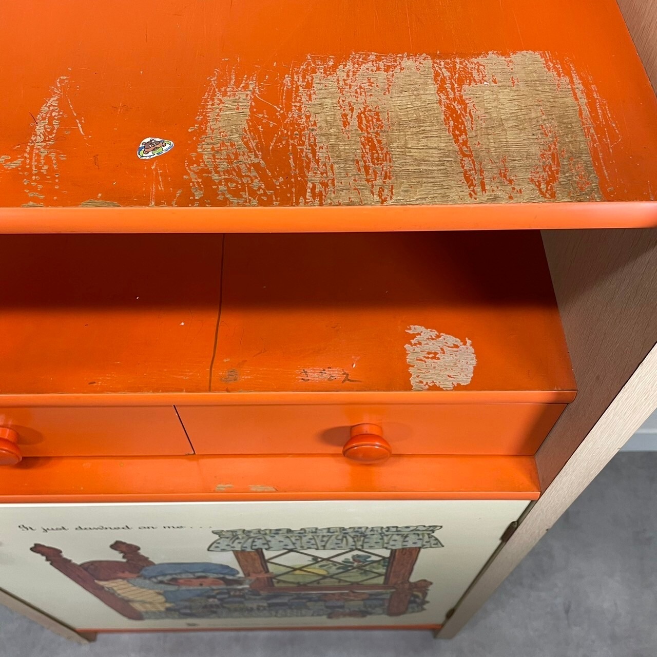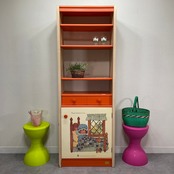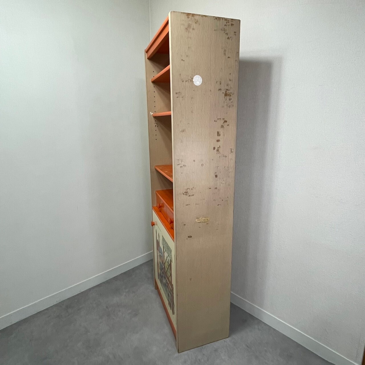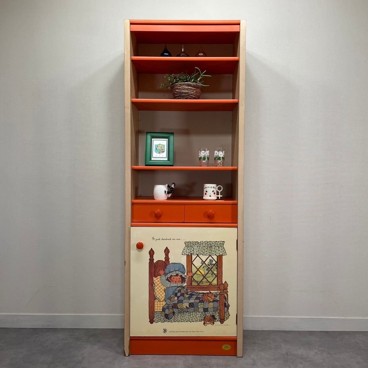 優しくノスタルジックなイラストが描かれたオレンジ色の本棚。