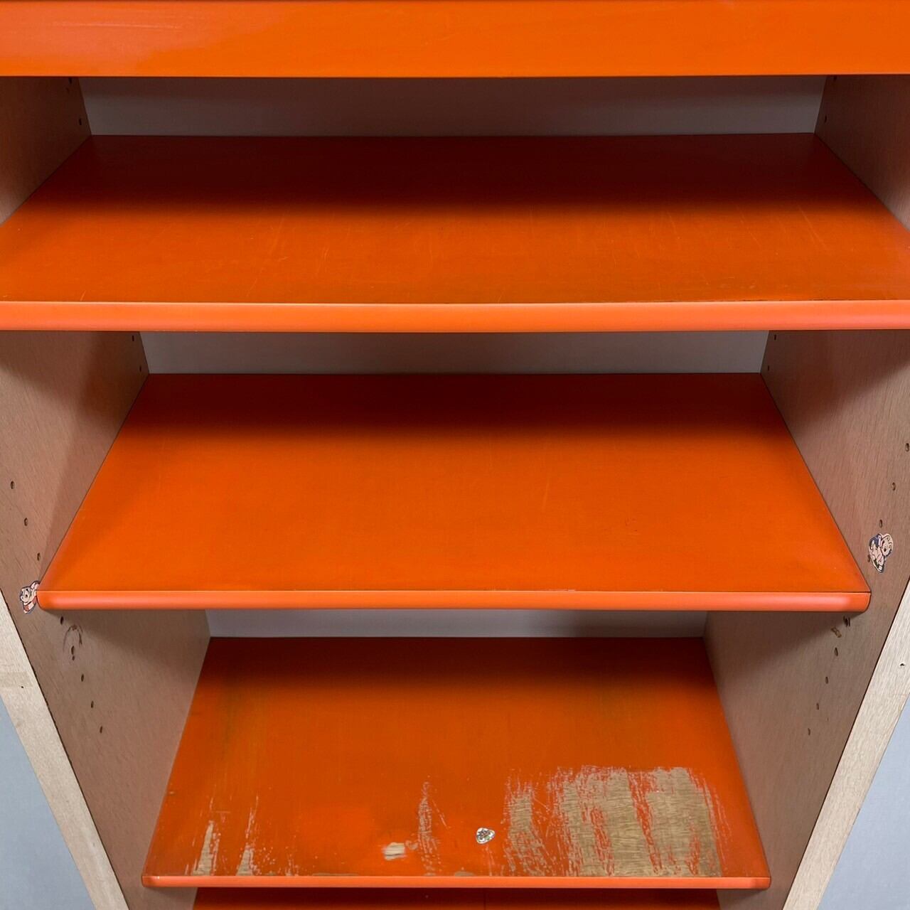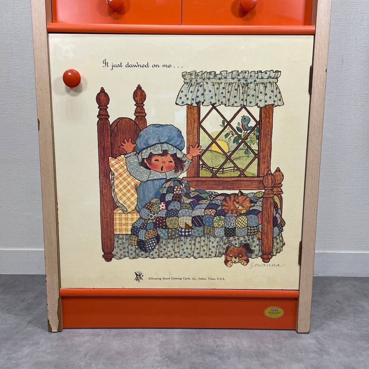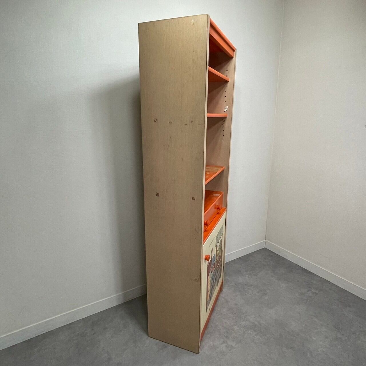 優しくノスタルジックなイラストが描かれたオレンジ色の本棚。