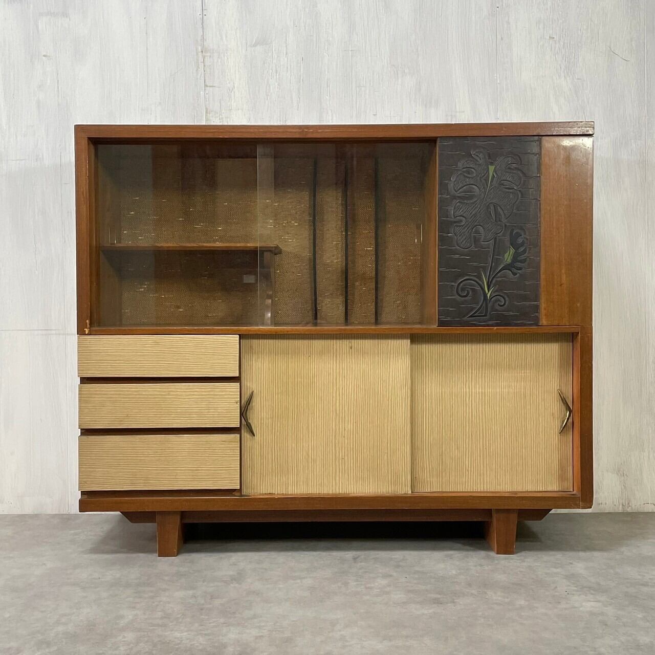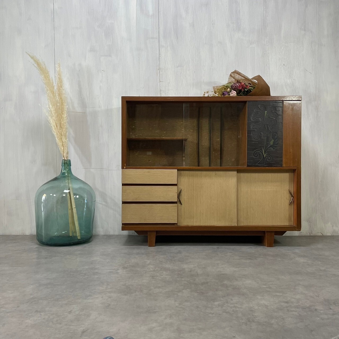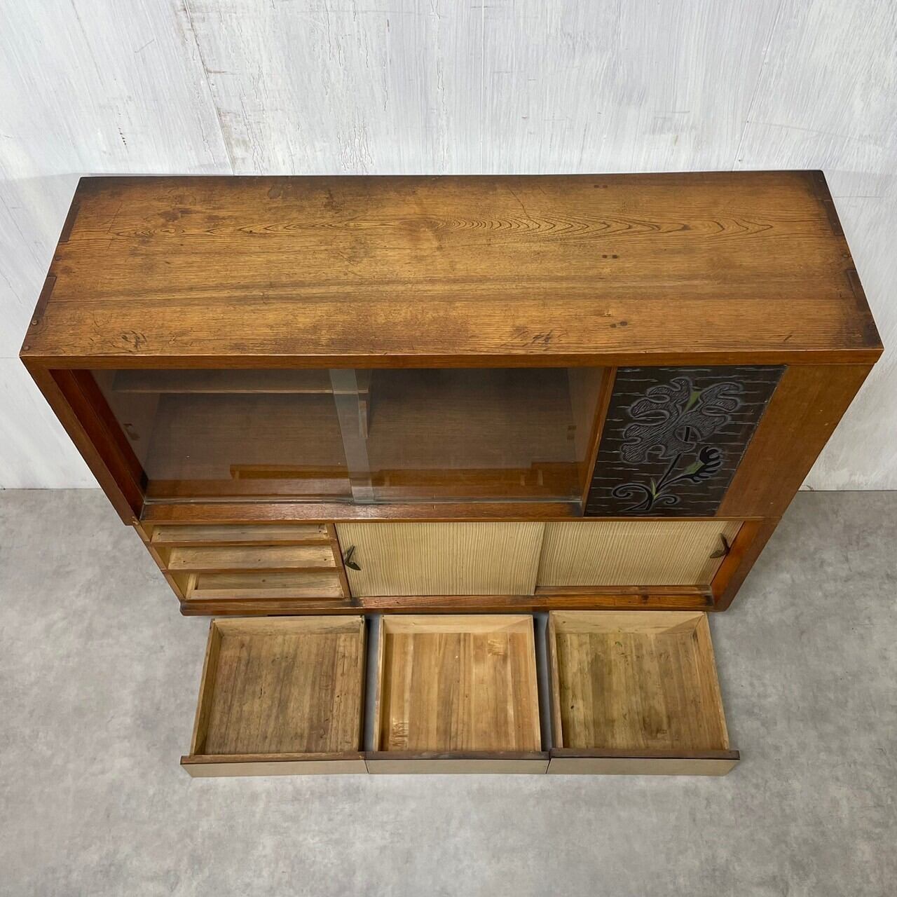 全体的にはシンプルながらも特徴的な金具の取手や上段右端に描かれた印象的な植物がアクセントとなっております。