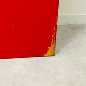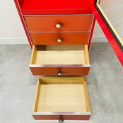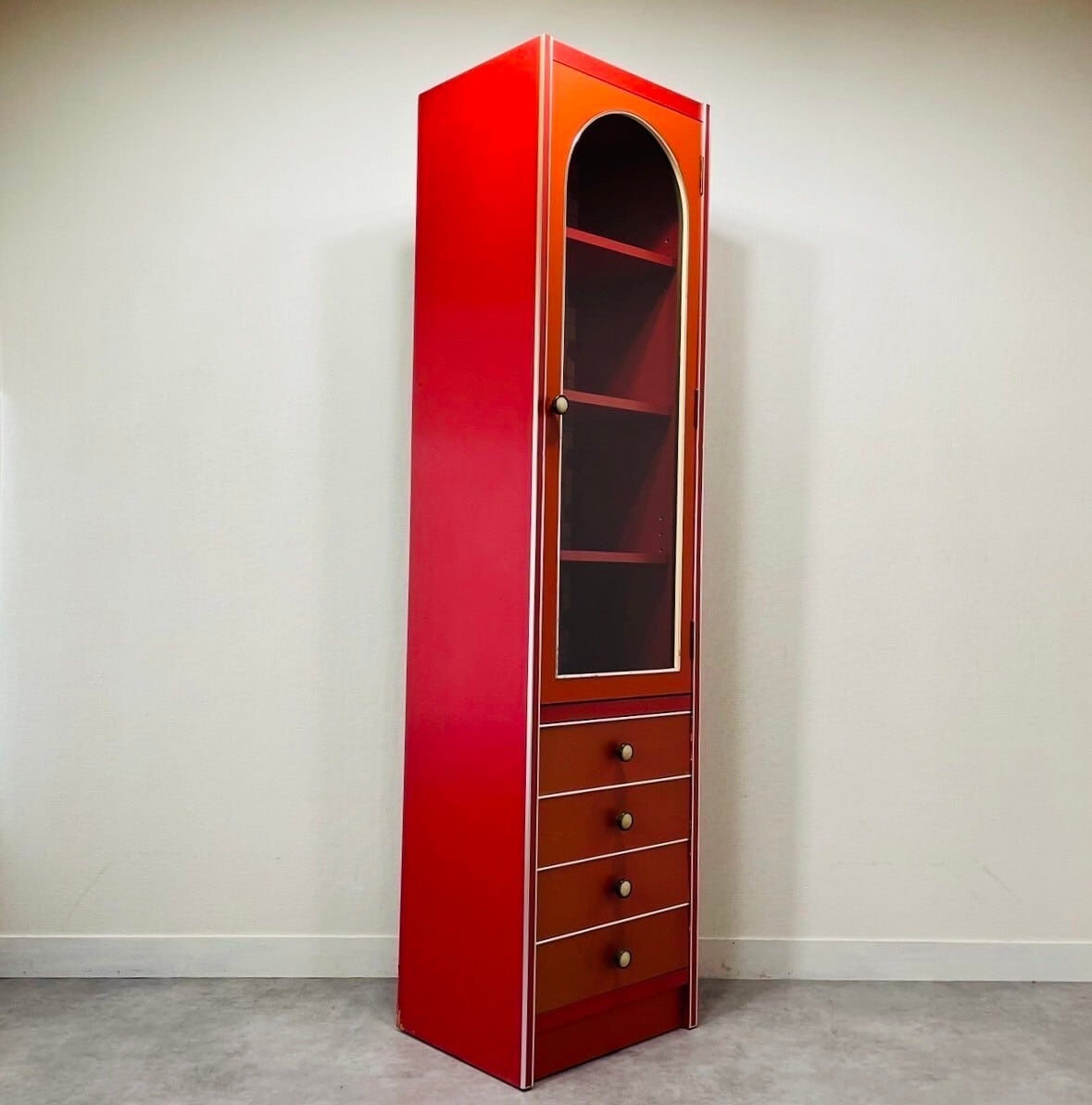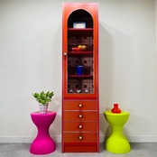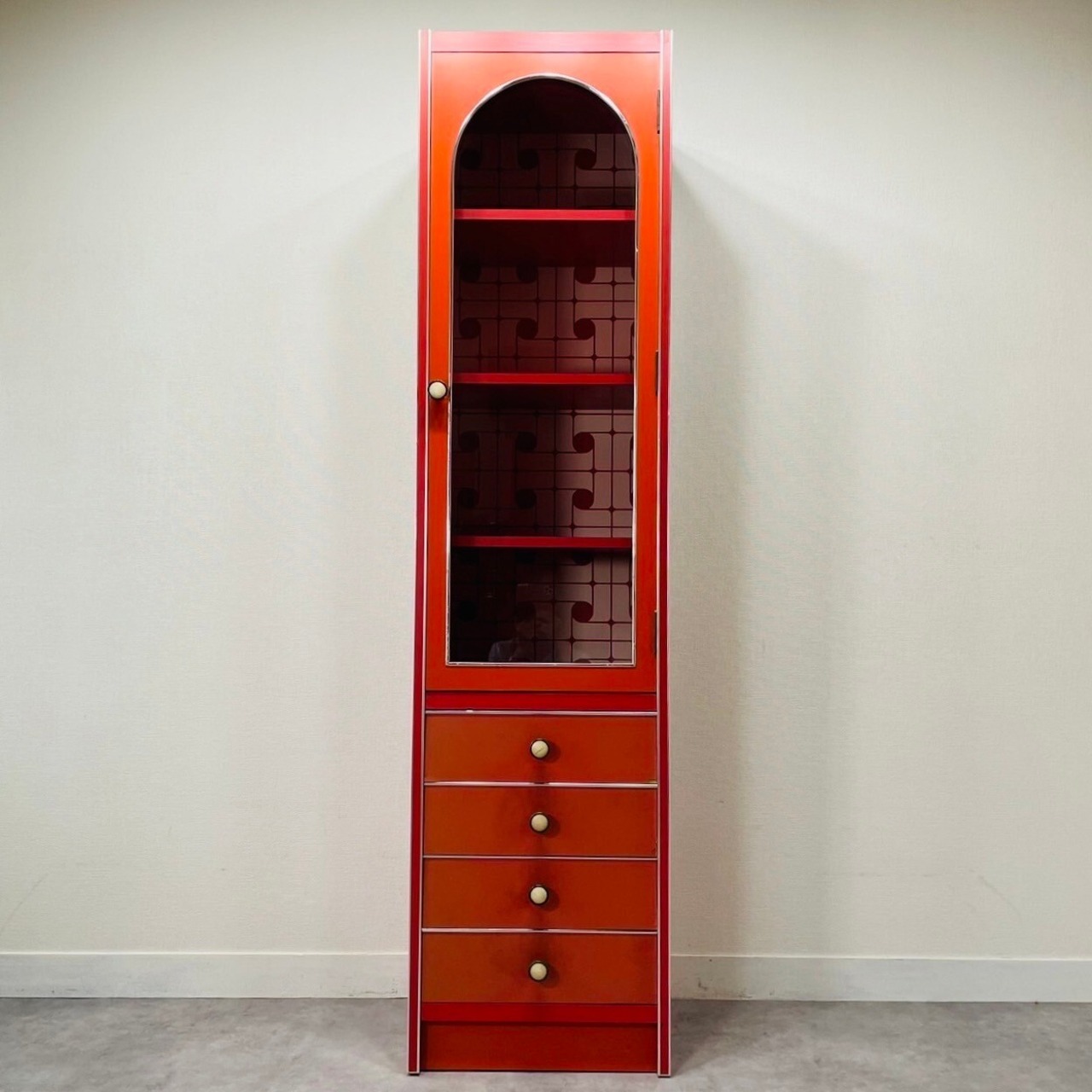 前面は主にオレンジ色で側面や棚板は赤色とポップなカラーリング。(アップの写真を見て頂けますとわかりやすいかと思います。)