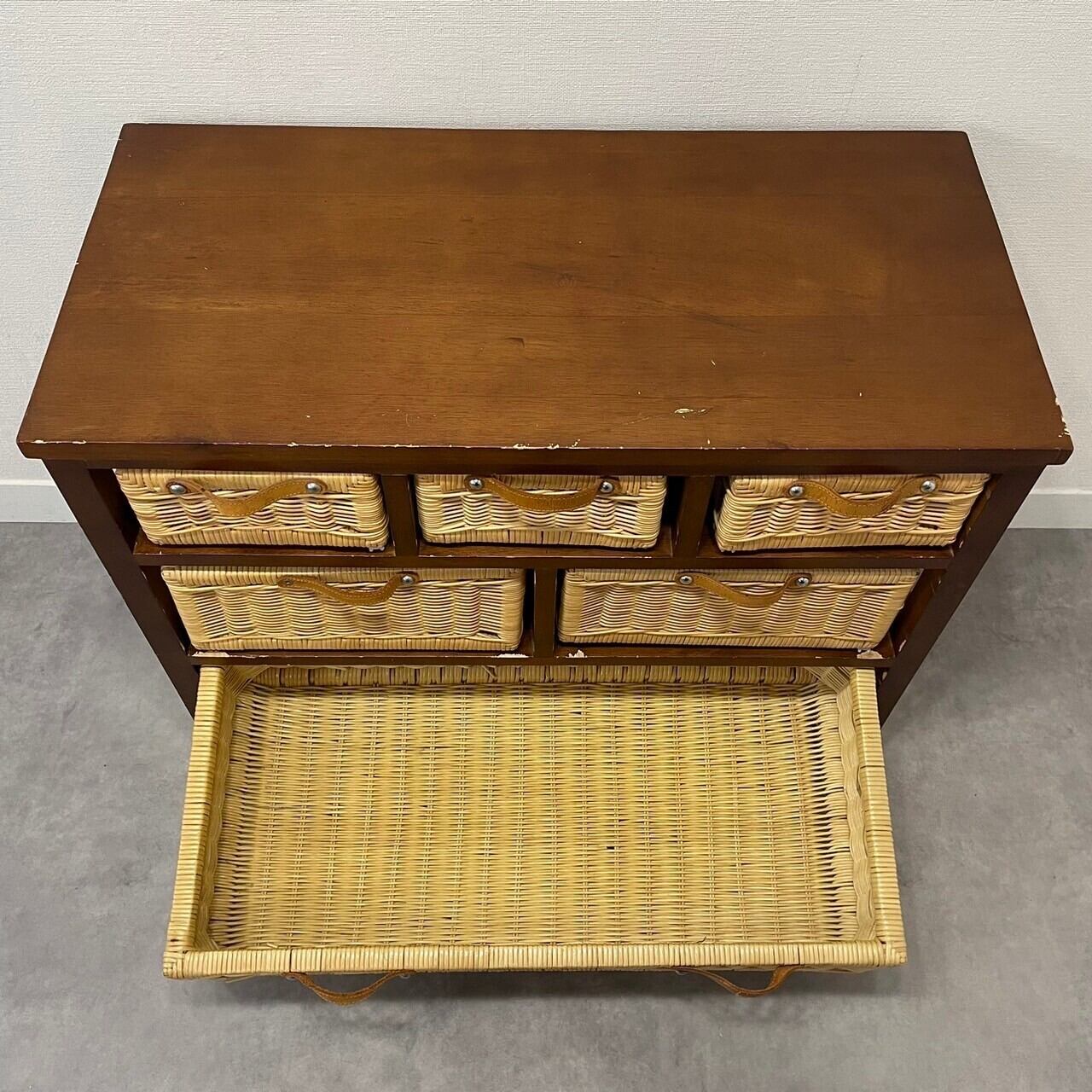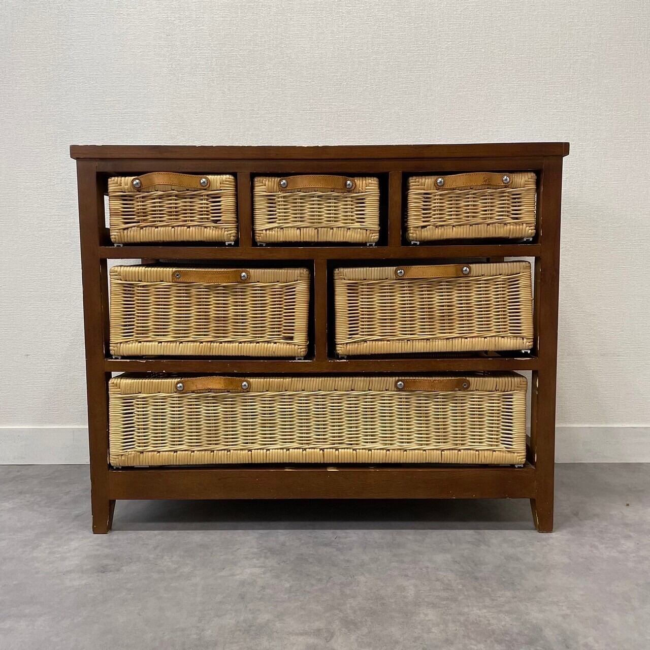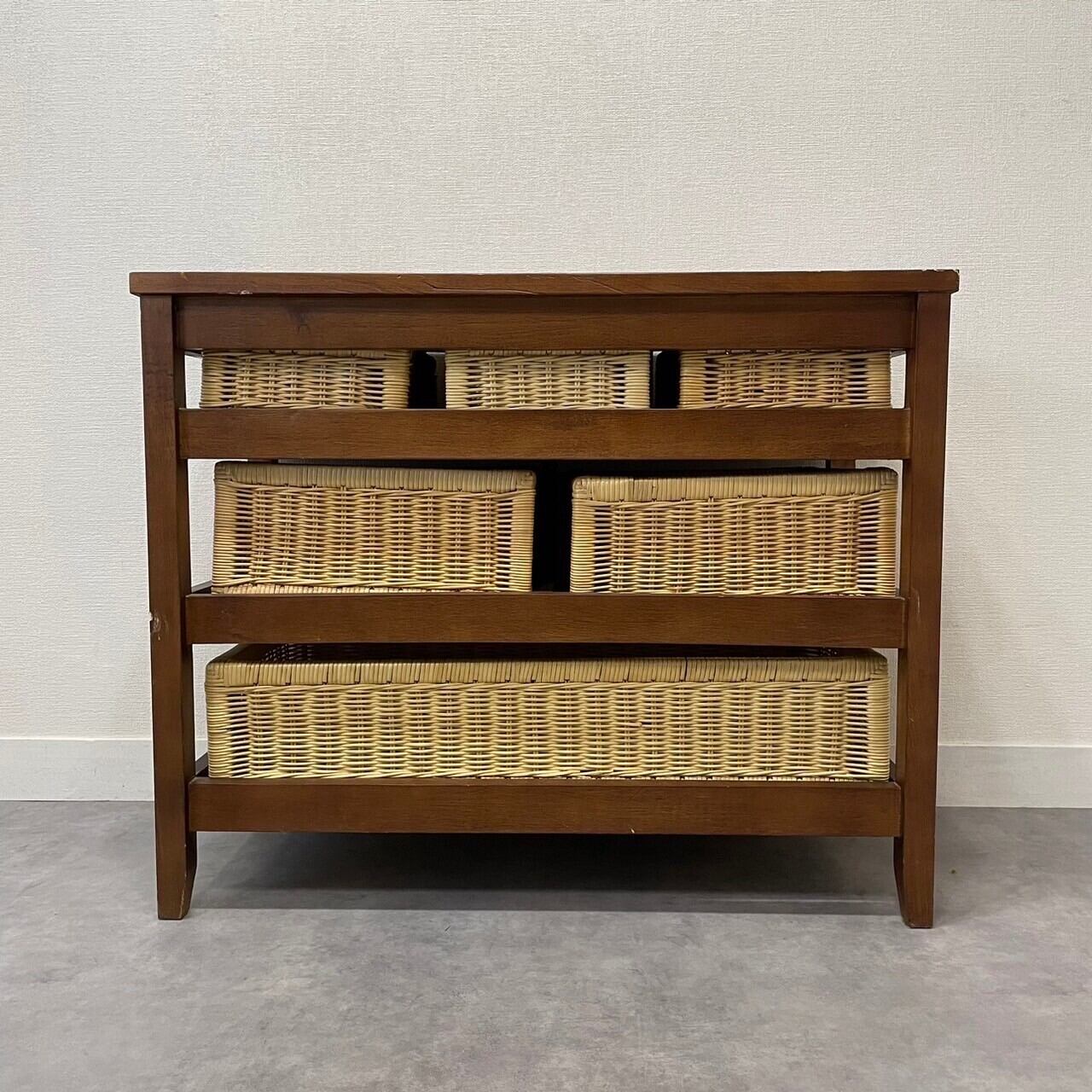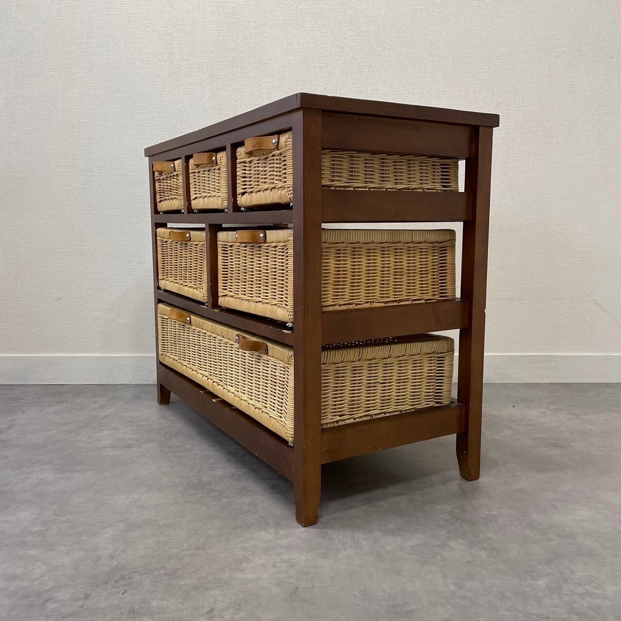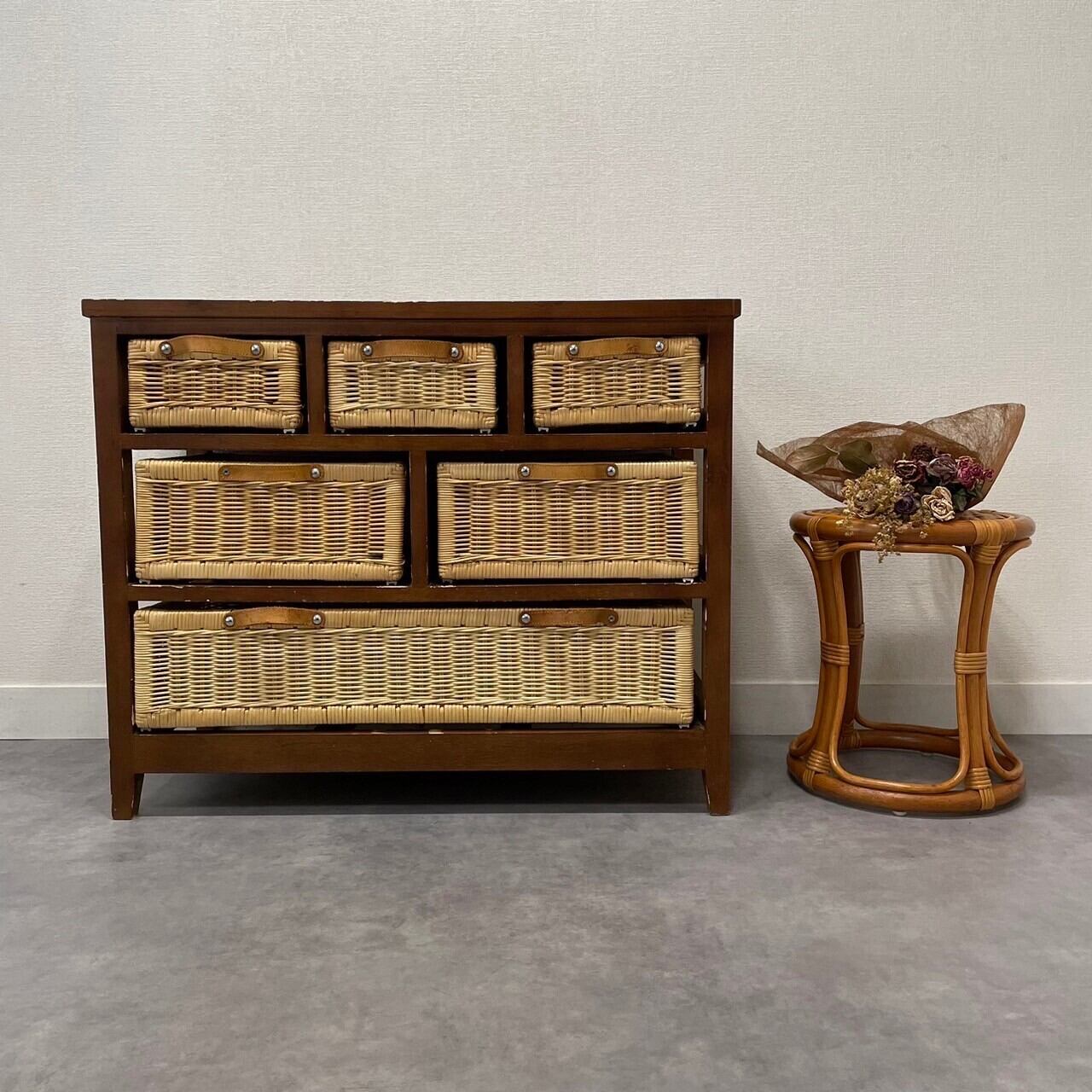 ブラウンカラーの無垢材フレームにベージュのラタンバスケットを合わせたナチュラルなカラーリングが素敵な収納チェスト。